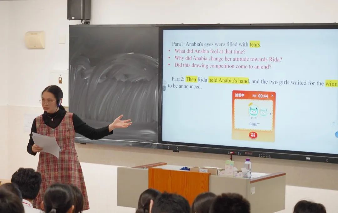 黄安琪老师选取了以友情为主题的读后续写材料,借助智慧笔与精心设计的选择题,帮助学生迅速梳理并理解原文的核心情节。课堂中运用远程投屏技术,实时展示学生的作品,同时引入AI生成的内容。通过对比学生作品与AI生成的内容,学生能够清晰洞察读后续写中需要改进与提升的要点。