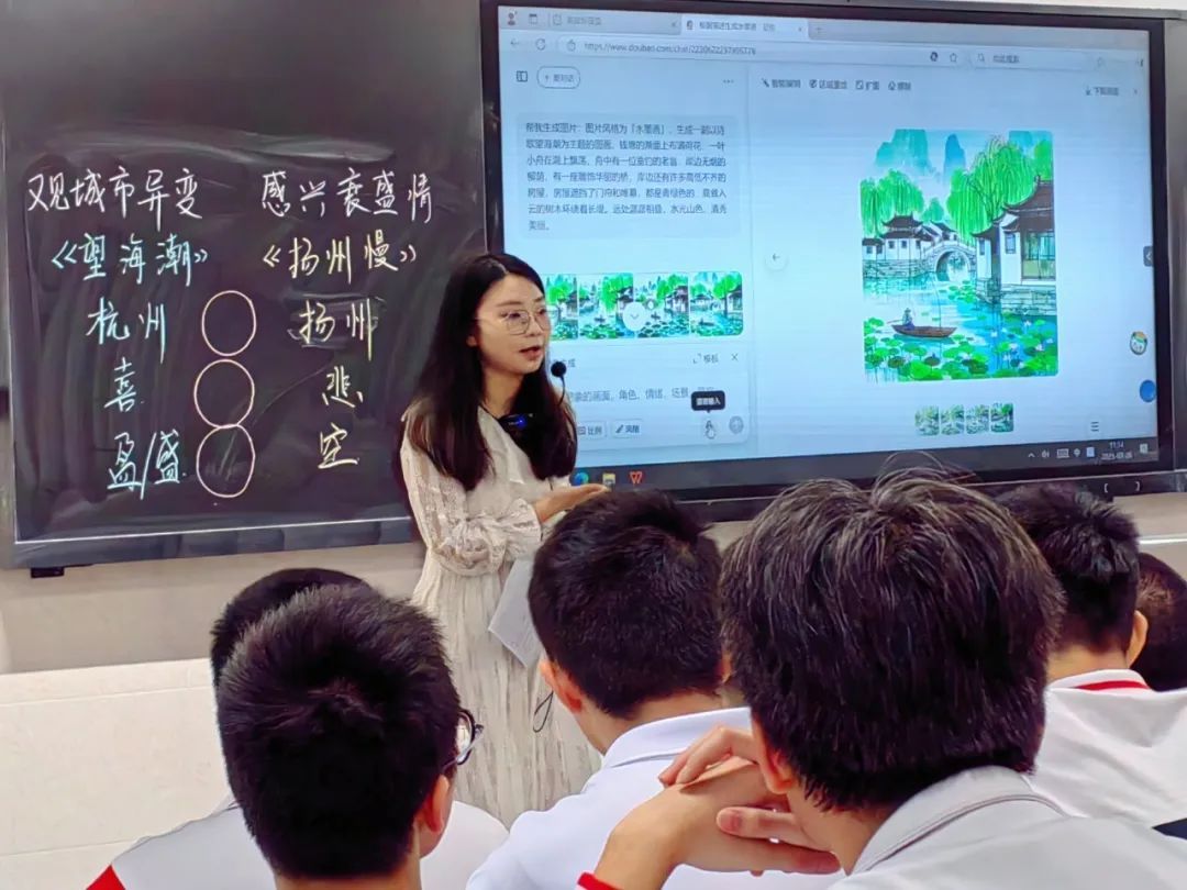 刘畅老师从“声传诗情”的韵脚品析切入,以“图绘诗情”任务推动学生挖掘词作意象,借助小组合作与AI绘图指令,将抽象文字转化为具象画面;通过“词抒诗情”的策展推介词写作,深化学生对城市兴衰的情感共鸣。教师借助智慧笔的实时圈画、选择功能,并同步投屏展示典型示例,学生的思考痕迹得以可视化,教师能精准捕捉学情并调整教学策略。