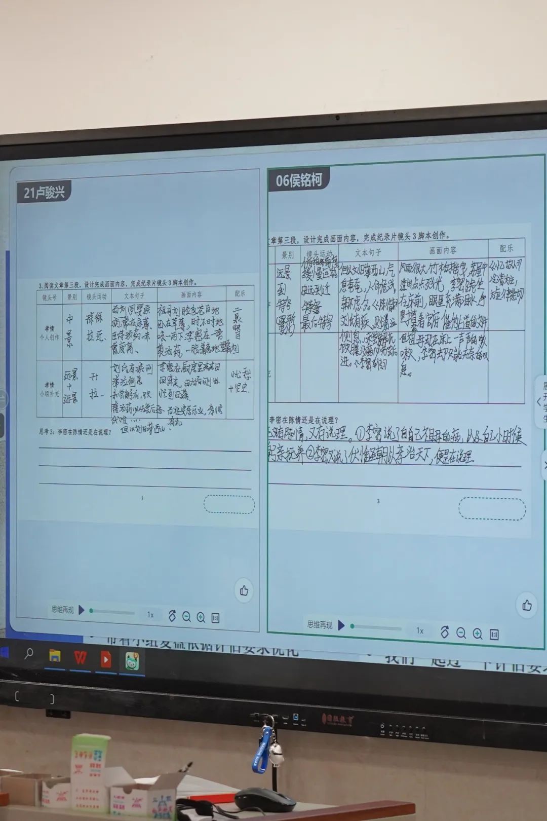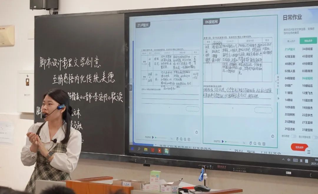 袁黄欣老师以“拍摄纪录片”为项目式学习框架,学生联读《陈情表》《晋书·李密传》,通过分镜头脚本设计融合文本解读。智慧笔实时标注人物情感关键词,同步投屏展示学生创意;小组脚本通过智慧课堂多屏对比呈现,最终以智慧笔投票评选“最佳导演”,让文言学习从“被动记忆”转向“沉浸式创作”。