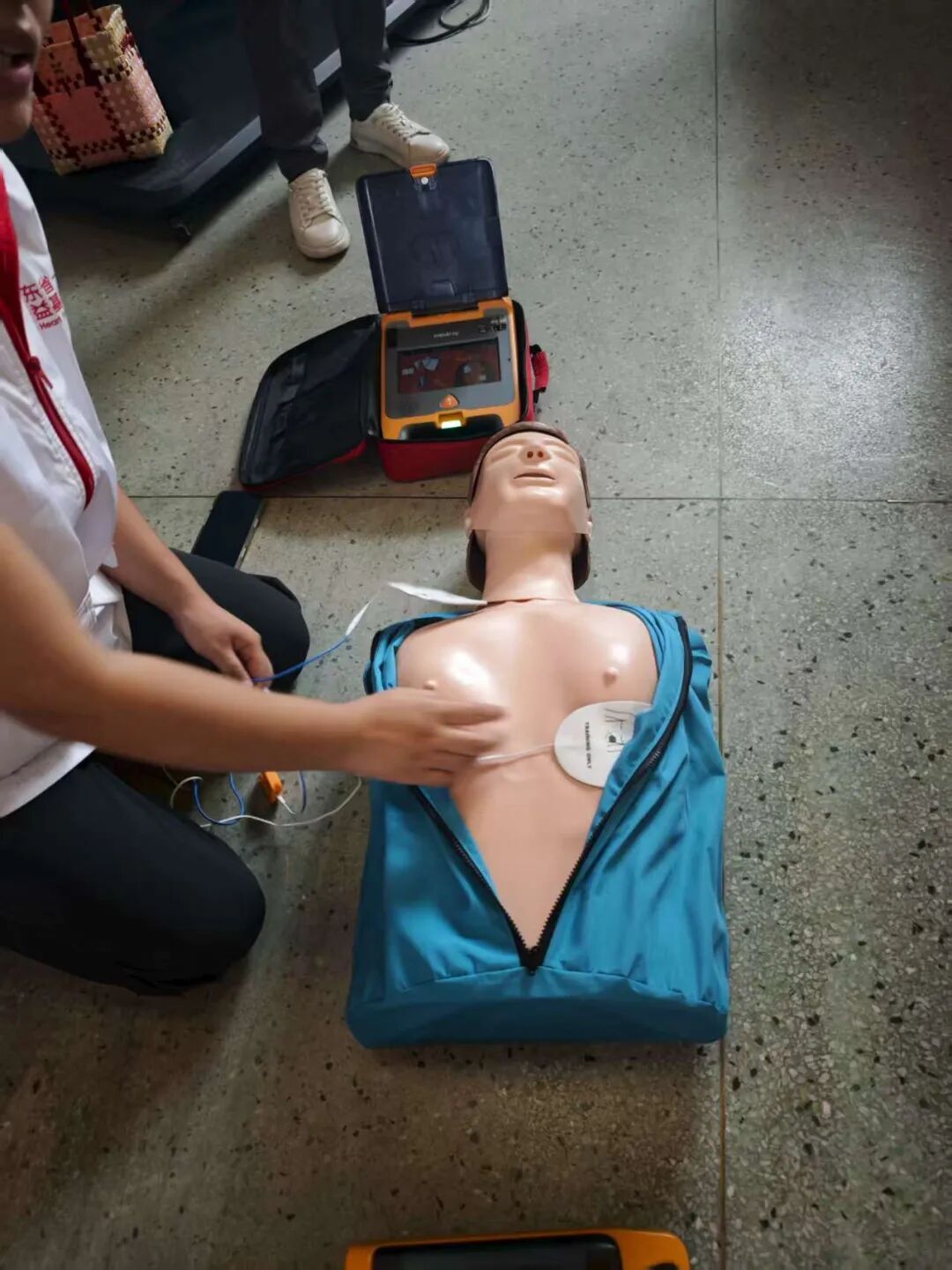 紧接着,专业导师为城西小学的教师们开展了应急救护实操培训。导师详细讲解了心肺复苏的操作流程和技巧,以及AED的使用方法。学员们通过模拟情景,在指导下进行AED操作练习,增强了实际操作能力。参加培训的老师感慨道,感谢这次培训,让我们在关键时刻能够伸出援手,挽救更多的生命。